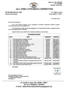 प्रदेश प्रभारी कुमारी सैलजा की ओर से एक सूची पहले भीं जारी की गई थी जिसमे 19 सदस्य थे लेकिन पुनः जारी समन्वय समिति की संशोधित सूची में प्रदेश कांग्रेस अध्यक्ष करन माहरा समिति के अध्यक्ष होंगे तथा नेता प्रतिपक्ष यशपाल आर्य, पूर्व मुख्यमंत्री हरीश रावत, केन्द्रीय चुनाव समिति के सदस्य प्रीतम सिंह, पूर्व प्रदेश अध्यक्ष गणेश गोदियाल, एआईसीसी सचिव एवं विधायक काजी निजमुद्दीन, उपनेता प्रतिपक्ष भुवन कापडी, पूर्व विधानसभा अध्यक्ष गोविन्द सिंह कुंजवाल, विधायक तिलकराज बेहड़, पूर्व मंत्री डॉ.हरक सिंह रावत, पूर्व मंत्री नवप्रभात, विधायक ममता राकेश, विक्रम सिंह नेगी, पूर्व मंत्री हीरा सिंह बिष्ट, पूर्व सांसद प्रदीप टम्टा, पूर्व एआईसीसी सचिव प्रकाश जोशी, जोत सिंह गुनसोला, विरेन्द्र सिंह रावत एवं प्रदेश उपाध्यक्ष मथुरादत्त जोशी सदस्य तथा महिला अध्यक्ष ज्योति रौतेला, युवा अध्यक्ष सुमित्तर भुल्लर, सेवादल अध्यक्ष हेमा पुरोहित व एनएसयूआई अध्यक्ष विकास नेगी विशेष आमंत्रित सदस्य होंगे।