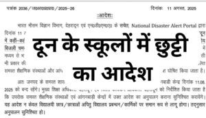 भारत मौसम विज्ञान विभाग, देहरादून एवं एन०डी०एम०ए० के सचेत, National Disaster Alert Portal द्वारा दिनांक 11 अगस्त, 2025 को जारी अद्यतन मौसम नॉउकास्ट के अनुसार दिनांक 11 अगस्त, 2025 को जनपद देहरादून में कहीं-कहीं भारी से अत्यंत भारी वर्षा कुछ जगहों पर भारी से बहुत भारी वर्षा कही कहीं गर्जन के साथ आकाशीय बिजली चमकने/वर्षा के अति तीव्र दौर का “औरेंज’ अलर्ट जारी किया गया है। वर्तमान में जनपद के समस्त क्षेत्रों में मध्यम से भारी वर्षा के दृष्टिगत संवेदनशील स्थलों में भूस्खलन / त्वरित बाढ़ की सम्भावना बढ़ जाती है। जिससे किसी भी प्रकार की अप्रिय घटना घटित हो सकती है। आपदा न्यूनीकरण के दृष्टिगत जनपद के कक्षा 01 से 12 तक संचालित समस्त शैक्षणिक संस्थाओं और आंगनबाडी केन्द्रों में दिनांक 11.08.2025 को एक दिन का अवकाश घोषित किया जाता है।