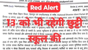 भारत मौसम विज्ञान विभाग, देहरादून एवं एन०डी०एम०ए० के सचेत, National Disaster Alert Portal द्वारा दिनांक 12 अगस्त, 2025 को जारी अद्यतन मौसम पूर्वानुमान के अनुसार दिनांक 13 अगस्त, 2025 को जनपद देहरादून में कहीं-कहीं भारी से अत्यंत भारी वर्षा कुछ जगहों पर भारी से बहुत भारी वर्षा कहीं-कहीं गर्जन के साथ आकाशीय बिजली चमकने/वर्षा के अति तीव्र दौर का ‘रेड’ अलर्ट जारी किया गया है। वर्तमान में जनपद के समस्त क्षेत्रों में मध्यन से भारी वर्षा के दृष्टिगत संवेदनशील स्थलों में भूस्खलन / त्वरित बाढ़ की सम्भावना बढ़ जाती है। जिससे किसी भी प्रकार की अप्रिय घटना घटित हो सकती है। आपदा न्यूनीकरण के दृष्टिगत जनपद के कक्षा 01 से 12 तक संचालित समस्त शैक्षणिक संस्थाओं और आंगनबाडी केन्द्रों में दिनांक 13.08.2025 को एक दिन का अवकाश घोषित किया जाता है।
