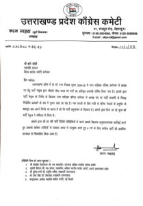 उत्तराखंड प्रदेश कांग्रेस कमेटी द्वारा नगर निकाय चुनाव में विभिन्न नगर निगम, नगर पालिका एवं नगर पंचायत क्षेत्रों में पार्टी प्रत्याशी के खिलाफ बागी उम्मीदवार के रूप में चुनाव लडने वाले कांग्रेसजनों एवं पार्टी विरोधी गतिविधियों में संलिप्त पार्टी नेताओं को तत्काल प्रभाव से कांग्रेस पार्टी की प्राथमिक सदस्यता से 6 साल के लिए निष्कासित किया गया है।